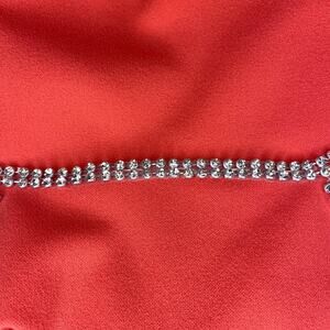 Sparkling rhinestones trace the waist and side cutouts of this sleeveless square-neck gown made from scuba-crepe fabric with slight stretch; spaghetti straps, back zipper closure, side slit, light built in padding at bust