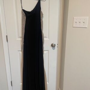 Sleek, comfortable one shoulder black long dress. Nude underlay on both sides is covered in silver sequins and is not see through. Clean and smoke free item.