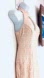 Just enough stretch for comfort and shape while wearing, not a very dress. Lace with a sprinkling of (stitched on) tiny, flat sequins. Pale pink halter gown with front keyhole and racerback. Choke-type collar, high neck. Princess seams. Modesty panels (slightly padded bust). Side panels for fit and comfort. Concealed back zipper. Fitted to just below mid thigh on average height, then flares in a semi-extreme mermaid tail. Thin knit lining reaches top of mermaid tail; the tail itself is mesh lined. See photos for content and care.