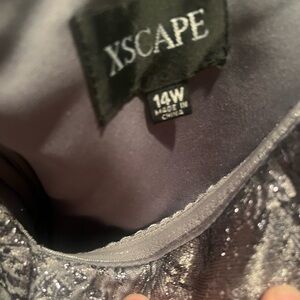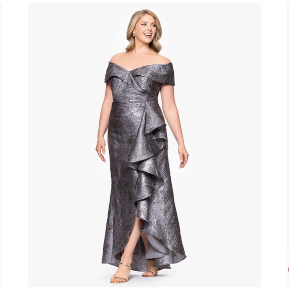 Xscape Metallic Gray Off-Shoulder High-Low Ruffle Gown