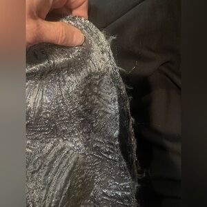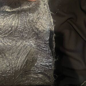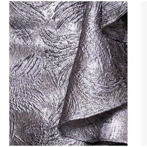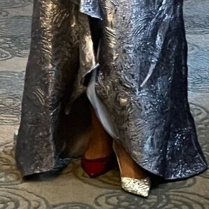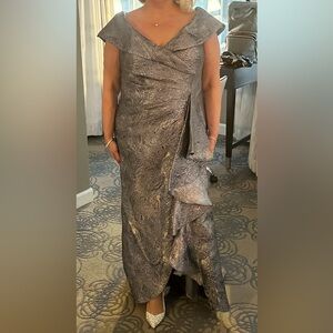 Off-shoulder metallic gown with sculpted ruffle cascading down front. Textured fabric provides subtle shine. High-low hem reveals a graceful silhouette. Ideal for formal evenings and special events. Worn once. Does have one spot on the bottom of train where it drug on the floor. It was taken up to fit me. I am 5’3” Please see all photos. Armpit to armpit 19 inches. No length was taken off. Just in the shoulder area and can be let out.