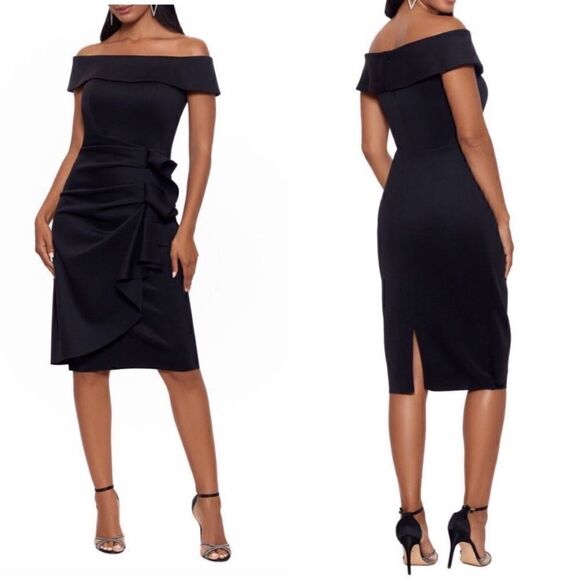 Xscape NWT Ruffle Off the Shoulder Scuba Dress In Black Size 12