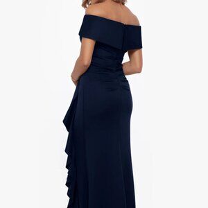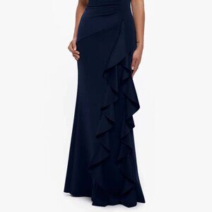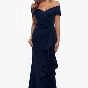Xscape Navy Blue Ava Off the Shoulder Side Ruffle Evening Gown