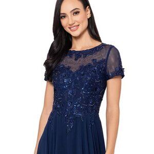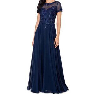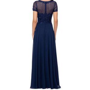 Xscape Navy Blue Beaded Mesh Gown