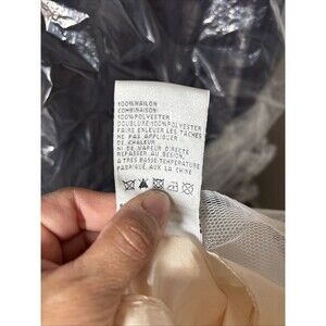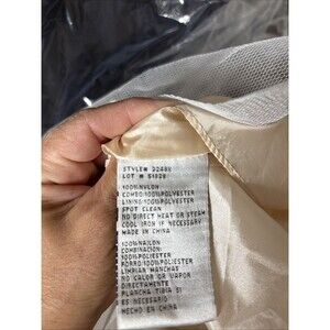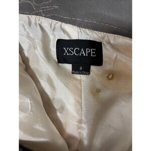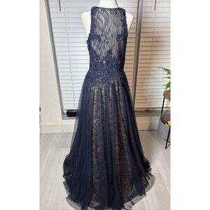 Elegant XSCAPE navy blue lace gown in size 8. Features intricate floral lace overlay with beaded embellishments, sheer illusion neckline, and tulle A-line skirt. Perfect for formal events, prom, weddings, quinceañeras, and evening occasions. Excellent pre-owned condition.