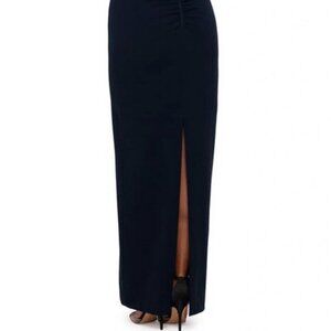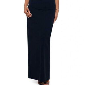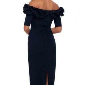 Xscape Navy Blue Ruffle Off the Shoulder Crepe Column Gown