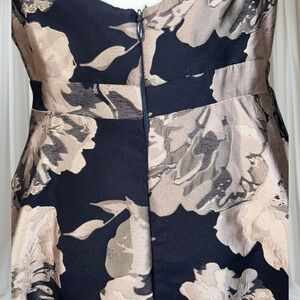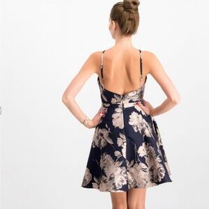 Elegant mini dress with floral pattern. Navy base with gold accents. Sleeveless design. Perfect for special occasions.