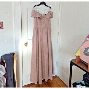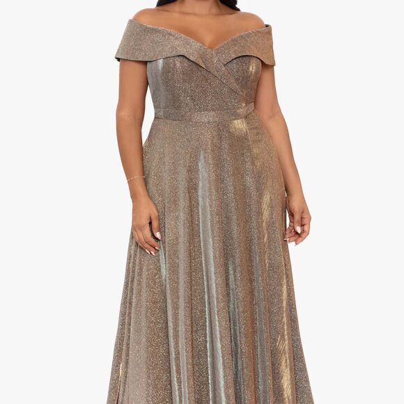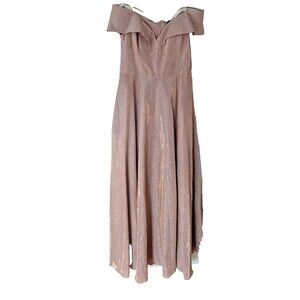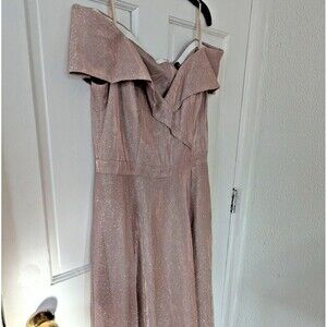 Elegant Xscape prom dress. Off-shoulder design with shimmering fabric. Perfect for special occasions. dress is brand new. Size 18 W Rosy sparkle color