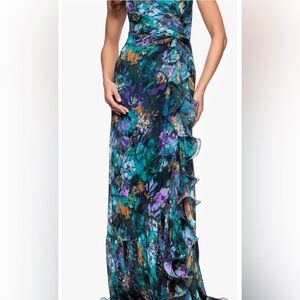 Strapless Ruffle Floor Length Dress worn once to daughter’s wedding. Beautiful colors. I’m 5’2” perfect length.