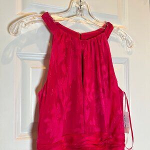 Turn heads in this stunning Xscape evening gown, brand new with tags. This vibrant pink halter-neck gown features a flattering gathered waistband, tiered cascading ruffles, and subtle floral jacquard detailing with a hint of shimmer. The full-length silhouette and flowing high-low hemline add dramatic elegance—perfect for weddings, galas, or formal events.