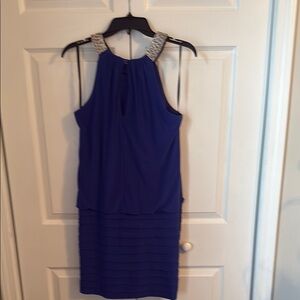 Chic mini dress in royal blue. Features a striking silver embellished neckline. Perfect for evening events. Worn once.