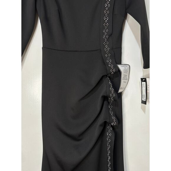 Xscape Ruched Black Gown Dress Size 4 NWT Ruffle Design Beaded Embellishments