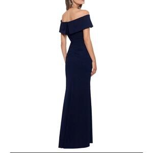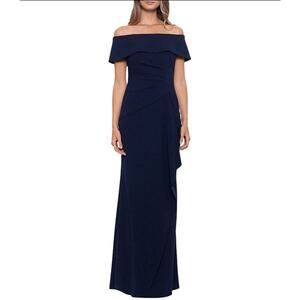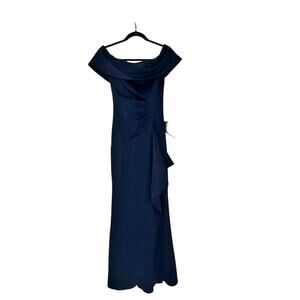 Xscape Ruffled Off-The-Shoulder Evening Gown Maxi Dress Navy Blue Size 4 NWT