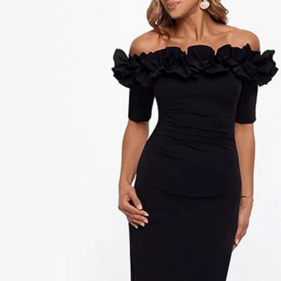 Xscape (BLACK) | Ruffled Off-the-Shoulder Elbow Length Sleeve Crepe Sheath Gown | Sz 16