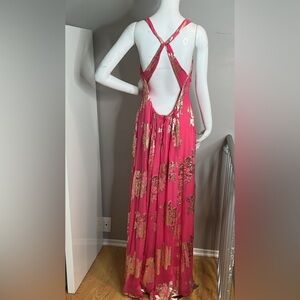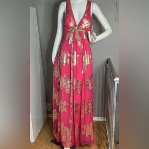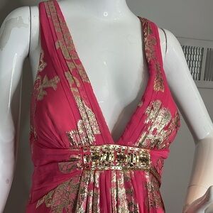 This is a beautiful Xscape Sz 10 Pink Silk Gold Lurex Full Length Sleevles Gown Dress. Umpire waist adorned with crystals as metallic beads. Lightly padded cups, so no bra needed. Back zipper. Fully lined and the lining has a nice elastic to it, so very smoothing. Latex gold thread has some minor breaks but unnoticeable. The back cross straps can be made longer or shorter at any tailor as needed. Some dirt in the interior bottom slip from hitting the floor a little.