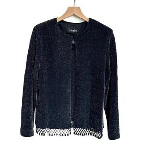 Tank top and long sleeve cardigan/jacket w one button closure at neck, beaded fringe at bottom, and padded shoulders.