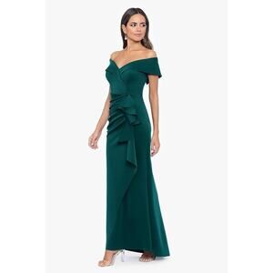 Xscape Women's Long Off Shoulder Sweetheart Neck Side Ruffle Gown, Sz 14P Hunter