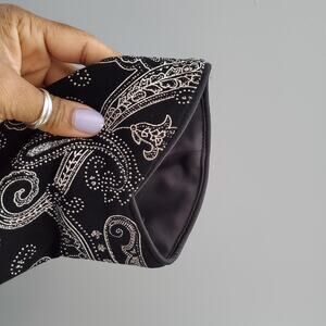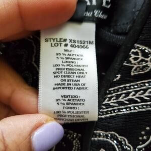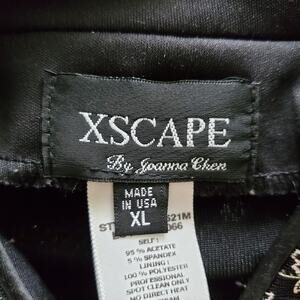 Xscape by Joanna Chen paisley sparkle Mandarin collar jacket with a hook closure at the neckline. This jacket is pre-loved and in great condition (no stains, no rips, or damage and comes from a smoke and pet-free environment).