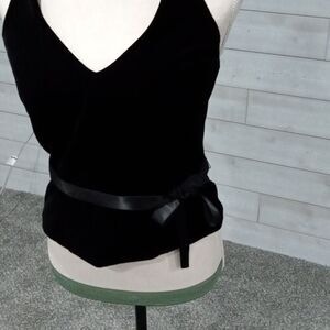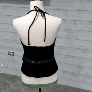Xscape by Joanne Chen Black Velvet halter bustier with boning. v-neck. ribbon bow at waist. back zipper. in excellent condition. size 6P