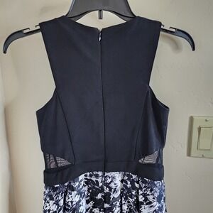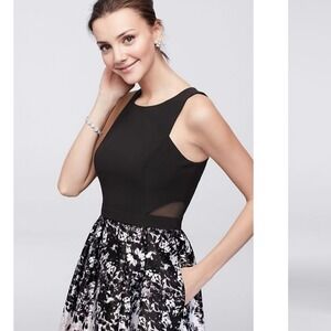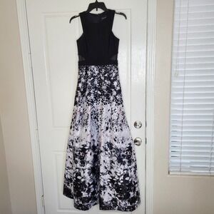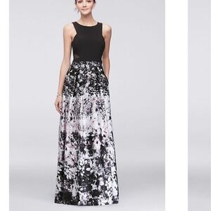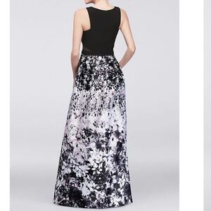 Xscape printed satin ballgown with illusion sides- black- EUC