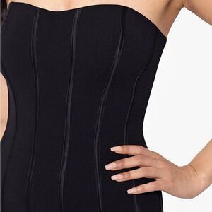 Tonal satin binding falls from neck to hem creating a silhouette that's interesting to look at for this strapless trumpet gown. 58" length Strapless Lined 100% polyester Spot clean Made in the USA