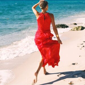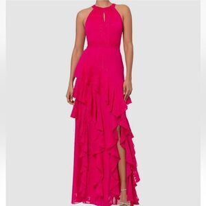 XSCAPET™ Long Metallic Chifon Tiered Ruffle Dress. It features a halter neckline with sleeveless design and asymmetrical ruffles designed on the A-line skirt.