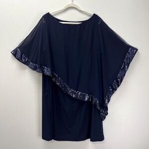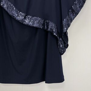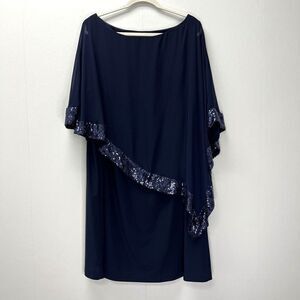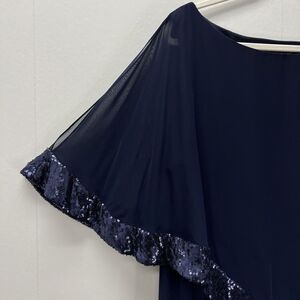 Xscape Capelet Midi Dress Navy Blue Sequin Trim Sheath Stretch Sheer Cape 22W