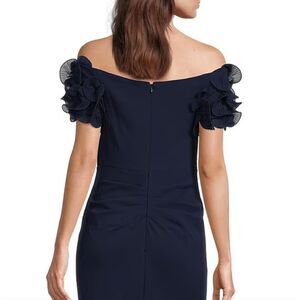 Xscape Rosette Off-the-Shoulder Short Sleeve Ruffle Ruched Waist Gown