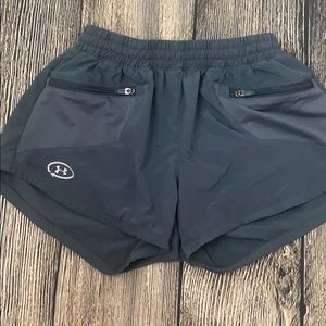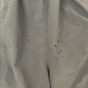 - grey underarmour grey shorts with green underwear insider, xsmall, darker grey marks on the front