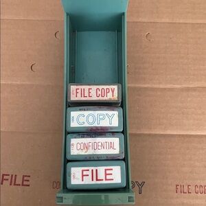 Set of Xstamper stamps with holder. Includes 'File', 'Confidential', and 'Copy' stamps. Light blue and white colors.