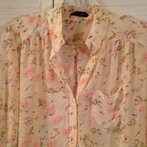 Excellent, Pre-Owned Condition--tags missing see measurements--Sheer, Polyester?, Yellow, Floral, Half Button, 3/4 Sleeves with Buttoned Cuffs and Roll Tabs, V Neck, One Pocket, High Side Slits, Scoop Hemline, Tunic/Blouse/Swim Cover Up. Shoulder-to-Shoulder: 15.5" Pit-to-Pit: 21" Sleeve: 18" Length: approx. 30"
