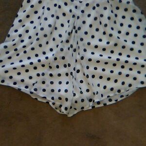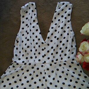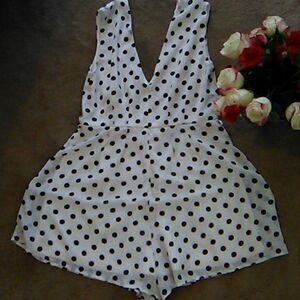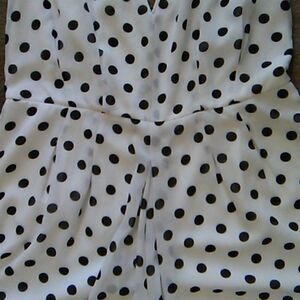 This super cute romper is perfect for now. Fun and flirty, and a little bit dressy. Pleats above and below waist. Full skirt. Full legs. V neck front and back. Fully lined and back zip. Size L measures 38 at chest, 29 at waist, 48 at hips, 16 inch rise. 34 inch leg opening. 16 long from waist to hem. Who doesn't love polka dots?