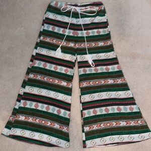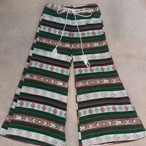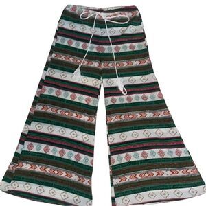 🔥These tribal palazzo pants from Xtaren are amazing! Colors of green pink gold orange and black in a beautiful print on a white base! Wide leg. Never worn. Drawstring cord with tassel for adjustable waist. 100 percent polyester!