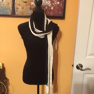 Thin & skinny but extra long in length; One side is black and the other White or light cream colored; has fringed edges; 100% acrylic; dry clean only; tag has been removed but think this was from H&M