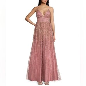 This Dillard's gown is adorned with shimmering rhinestones/gemstones in a captivating silver and gold hues, perfect for making a statement. The sleeveless design features a daring plunge neckline, while the full A-line skirt offers graceful movement.
