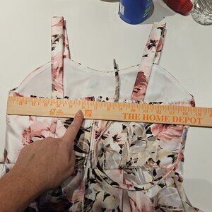 This dress came from Dillard's girls' dress department and retails for $70. It is a luxurious pink rose pattern with a stunning high-low hemline that makes the little girl feel like an absolute princess with a train (even though it doesn't drag behind her....my daughter found this to be her absolute favorite feature when she tried it on) the bodice details add another touch of elegance to an already elegant dress. Everything about this dress is classy and classic and is so pretty on. We bought this dress and took on a cruise to wear which is why the tags were taken off, but sadly, it didn't fit anymore once she put it on (she blamed the buffet haha!). I would say it does actually run a little on the small side!!