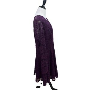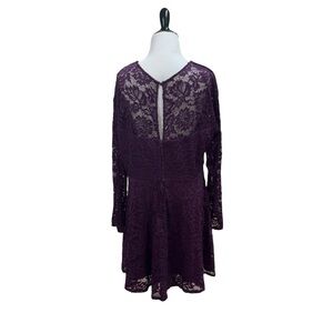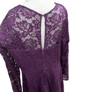 Xtraordinary! Women's Mini Dress in Size Junior 15 / Women's 16. Solid Purple lining with a purple lace overlay. Long sheer sleeves. The Fabric is a Nylon Spandex Blend. Zipper Closure in the back. V-Neckline. Good Condition. Chest measures 21 inches across when laid flat. Waist measures 18 inches across. Shoulder to hem measures 37 inches. Items purchased before 2 pm central time will ship the same day.