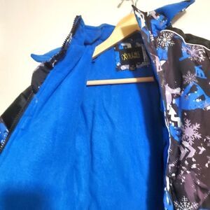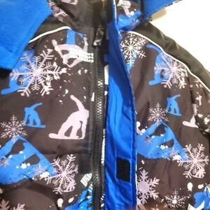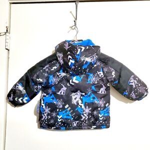 Blue and Black hooded winter print puffer jacket in a size 2T. Zipper closure detail. It's new with tags.
