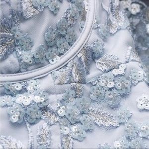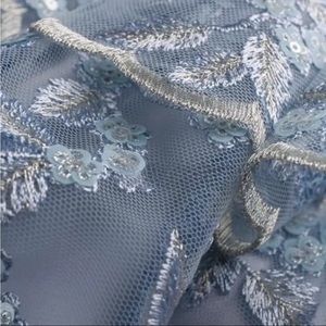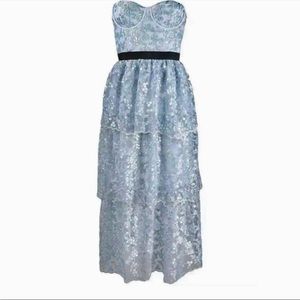 Lace with scallop trim and sequin floral design. Tiered strapless dress