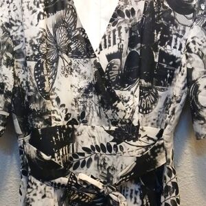 Black & white print mini dress. Butterflies, cameras, and city scape.