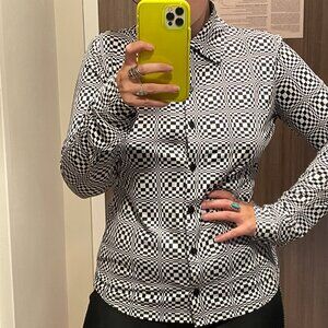 Details- Moda International checkered design in black and white optical illusion print. Button-down style with long sleeves.