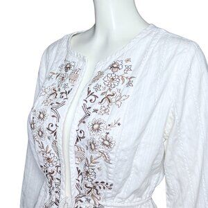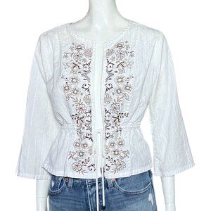 White 100% cotton tie waist peasant top with 3/4 length flared sleeves and brown floral embroidery by Christopher & Banks from 2007, two years shy of being officially vintage.
