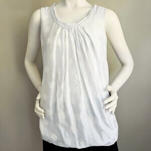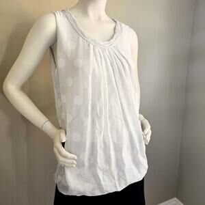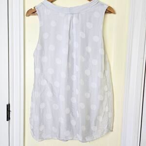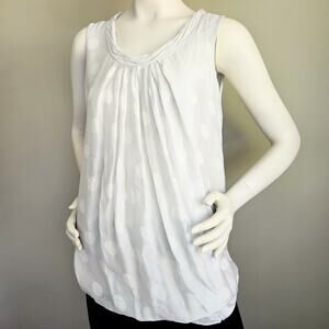100% silk sleeveless top in a light dove gray with white polka dots. There is a ruched gathered round neckline, and pleats on the front and back, which create drape and volume. Lightweight floaty silk. Fully lined in a soft, breathable, stretchy viscose and spandex jersey knit. There is no size or brand tag. Size is estimated based on measurements. See measurements.