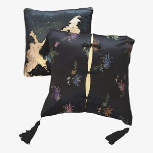• Black satin with colorful floral prints, Chinese Style, and black tassel corners- Pillow Case. Has 3 Chinese knot closures, on top, that opens to a shiny gold satin pillow.