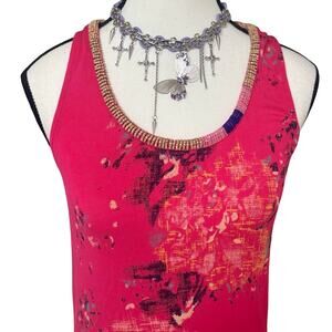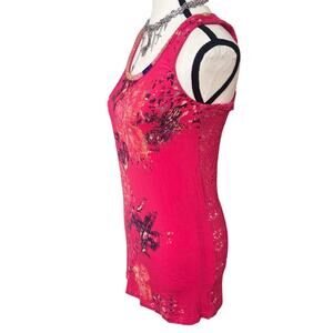 hot pink, floral print, beaded neckline, tank top, y2k style, vibrant, sleeveless, bold, statement piece, feminine