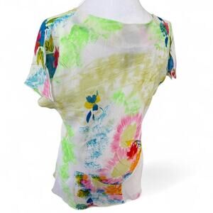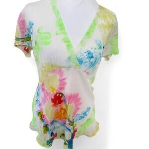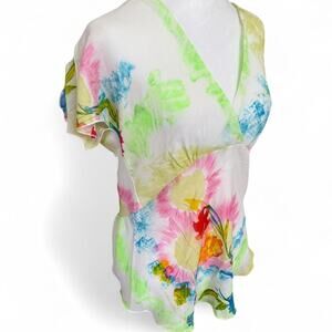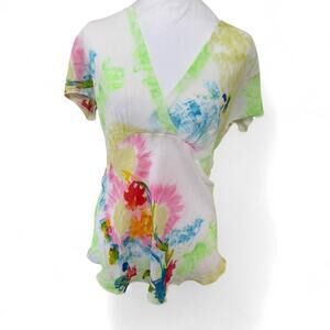 So pretty! Very light weight flowy material, white with v neck and bright colored floral graphic front design