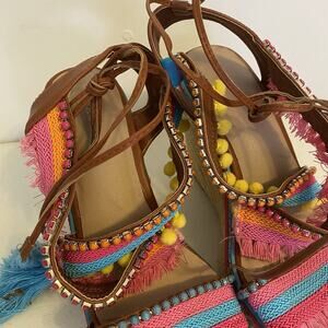 Y2K 2000s Mark Wedges Women 9 Boho Colorful 6.75” Heels Ankle Strap Rhinestone