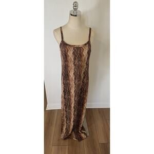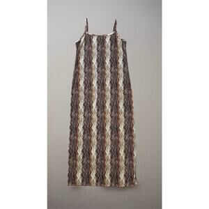 Y2K 2000s Maxi Slip Dress Spaghetti Strap Crinkle Zig Zag Abstract Brown M/L