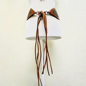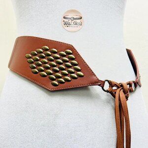 Y2K 2000s style Brown leather belt with gold studs and fringe