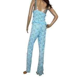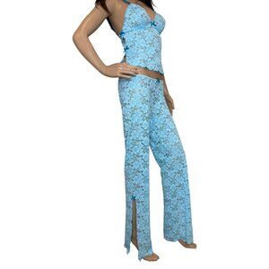 This Y2K 2003 Victoria's Secret pajama set features a blue floral lace babydoll top with adjustable straps, lace-up sides, and a dainty bow, paired with matching bottoms for a coordinated flirty look. Size small, this set blends sexy and sweet in true early 2000s style—perfect for lounging or special nights.